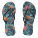 A beautiful pair of flip flops with a seamless paper floral pattern against a blue background.