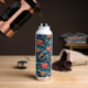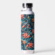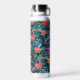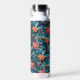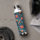 A beautiful water bottle with a seamless paper floral pattern against a blue background.