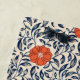Seamless floral pattern with vibrant orange flowers and navy blue leaves on a beige background, creating an ornate, symmetrical design.