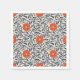 Seamless floral pattern with vibrant orange flowers and navy blue leaves on a beige background, creating an ornate, symmetrical design.