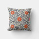 Seamless floral pattern with vibrant orange flowers and navy blue leaves on a beige background, creating an ornate, symmetrical design.