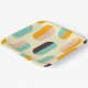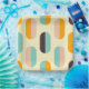 A seamless geometric pattern features vertical, oval shapes in soft yellow, teal, peach, orange, and brown, creating a retro, playful vibe.