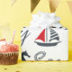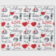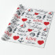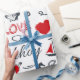 Seamless nautical pattern with nautical symbols (sailing boat, anchor, waves, seahorse, seashell) and red hearts decoration with text design on white background
