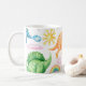 Seamless pattern depicting colored dinosaurs, rain coffee mug