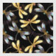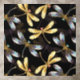 Seamless pattern with gold, jewelry, shiny dragonflies with detailed, sparkling wings on black background. Gold dragonfly.