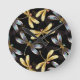 Seamless pattern with gold, jewelry, shiny dragonflies with detailed, sparkling wings on black background. Gold dragonfly.