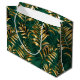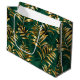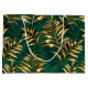 Seamless pattern of gold, jewelry, shiny fern branches and leaves on green, woodland, textured background. Golden fern.