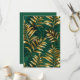 Seamless pattern of gold, jewelry, shiny fern branches and leaves on green, woodland, textured background. Golden fern.
