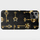 Seamless pattern of antique, gold and silhouette keys on black background.