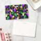 Seamless pattern of bright purple, green, and gold feathers on black Mardi Gras background. Design for the Mardi Gras holiday.