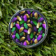 Seamless pattern of bright purple, green, and gold feathers on black Mardi Gras background. Design for the Mardi Gras holiday.