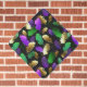 Seamless pattern of bright purple, green, and gold feathers on black Mardi Gras background. Design for the Mardi Gras holiday.