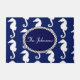 Endless and seamless pattern of white seahorses silhouettes over a navy ocean blue background.