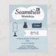 A flyer for a seamstress workshop or sewing activities with illustration of a sewing machine, a sewing mannequin, scissors, and a dress with sewing pins on a wavy light blue background. Perfect for activities such as dressmaker, alterations, repairs, fashion designer, tailor, handmade sewing, etc.