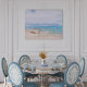 "Seas the Day" typography written quote in the sand of this captivating scene of a beached fishing boat on a sandy beach with watercolor aqua blue ocean,and sunny sky above.