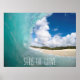 "Seas The Wave" saying on the aqua blue ocean wave tunnel of Haleiwa, Hawaii as it's crashing ashore the beach. Sunny blue sky and island backdrop.
