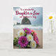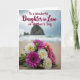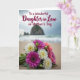 This greeting card features a close-up bouquet resting on textured beach sand, with petals in white, soft yellow, coral-pink, and deep pink nestled among lush green leaves 🌼. Behind the flowers, the ocean and shoreline fade into a gentle blur, where small waves roll in and distant rock formations rise under a cloudy sky. The softened background and diffused light give the scene a quiet, affectionate mood, like a thoughtful pause shared between close family members ❤️. Centered over the image is the message, “To a Wonderful Daughter in Law on Mother's Day,” set in flowing cursive-style lettering. The text appears in a deep, rich tone that stands out clearly against the pale sky and muted sea. The words sit mostly across the upper-middle area, leaving the bouquet unobstructed in the lower foreground. In the distance, dark sea stacks punctuate the horizon line beneath the gray, overcast clouds.