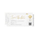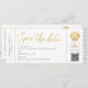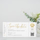 Seashell in faux gold foil on a modern and minimalist boarding pass plane ticket style save the date card for a beach wedding or ocean theme reception, with custom qr code generator, and tons of room for guest travel information and accommodation details and your photo on the back. It's important to send travel information early for destination weddings so your guests have time to plan their trip. This airline ticket save the date is perfect for a chic formal or casual ocean side wedding with a gold color scheme, and the printing looks very much like real foil even though it is printed in regular ink, making it more affordable especially for smaller and micro weddings.