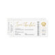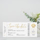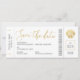 Seashell in faux gold foil on a modern and minimalist boarding pass plane ticket style save the date card for a beach wedding or ocean theme reception, with tons of room for guest travel information and accommodation details on the back. It's important to send travel information early for destination weddings so your guests have time to plan their trip. This airline ticket save the date is perfect for a chic formal or casual ocean side wedding with a gold color scheme, and the printing looks very much like real foil even though it is printed in regular ink, making it more affordable especially for smaller and micro weddings.
