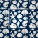 A graphic outline drawing of seashells by artist/designer Charmaine Paulson on a variety of products.