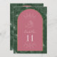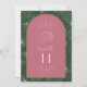 White line art palm leaves pattern over green background. White text and seashell designs over pink arch with yellow outline.