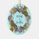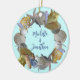 Seashell wreath name and date ornament. Round, ceramic Christmas keepsake for a couple to add their names on the front and year on back. Light blue background shows off a circle of tropical beach shells such as conchs, starfish, augers and naticas.