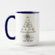 Navy blue and white coastal theme Christmas mug features a watercolor abstract beach with starfish and sand dollar seashells, sea glass, nautical rope, string lights and ocean pilings in the shape of a Christmas tree, with a "Seas & Greetings" caption (this can be personalized).