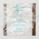 Seashells wedding menu template on square paper. Created for a simple reception with two text templates. Add a title that includes the names of the couple. All menu items are listed in a paragraph using spaces to separate sections for appetizers, entrées, and desserts, or your choice. Font is handwritten casual in dark brown. Seashell photography is the background image and is the same on the back.