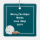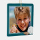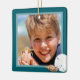 Photo Christmas ornament keepsake with seashells and text. Ceramic, square ornament has photo on one side and text on the other. Sea blue-green color frames the photo with a sand dollar and junonia seashell in the corner. On the back, use the text template to add his or her name, age, year, and any other text. Use as a keepsake for a son or daughter, or customize to give to grandparents at Christmas.