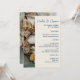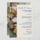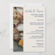 Seashells wedding menu template. Pretty beach shell photography decorates this custom card for receptions, parties and showers wherever a menu is needed. Dark blue, modern text is printed over seashell off-white color and is aligned to the right side. Names of the couple at the top are in handwritten script font. Bolder printed text is next for the menu title and date. List all food selections in paragraph form adding and removing spaces as needed. You may also download this design to print or share digitally.