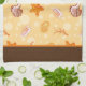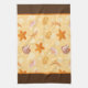 Shown on a white towel, this kitchen towel has images of seashells in the orange colors with a bottom border in cocoa brown and an orange stripe.