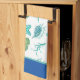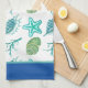 Shown on a white towel, this kitchen towel has images of seashells in the blue and green colors. Deep blue border with thin aqua border at bottom edges.