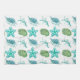 Shown on a white towel, this kitchen towel has images of seashells in the blue and green colors.