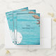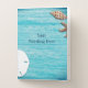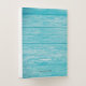 Blue wood grain pocket folder set with seashells and template text on the front. A wood-look wraps around to the back of the folder. Spotted junonia, starfish and sand dollar images on the front with printed blue text. Inside there are pockets to hold papers, and a business card tab.