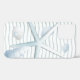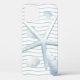 Soft bluish gray starfish, seashells, and an open oyster with a pearl....all over a background of the shadows of overlying ocean waves.