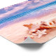 Beautiful romantic seascape with gently pink sandy shells on the beach. The wave gently washes the shore, pink clouds are floating in the blue sky. The atmosphere of paradise and serenity.