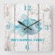 Stylish beach house style wall clock, with graphics of a white washed distressed wood background and beautiful aqua blue graphics of a decorative fish. Bold aqua blue numbers denote 12, 3, 6, and 9 o'clock. Personalize the aqua blue text to suit your needs. Makes a great gift idea.