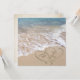 Hearts with couples' names and wedding date in beach sand with ocean surf anniversary dinner invite