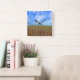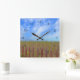 This wall clock features a stunning image of beach grass, fence, and blue sky.