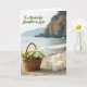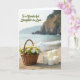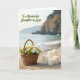 This card shows a calm seaside scene that feels like a gentle gift shared between close family ❤️. In the foreground, a woven wicker basket sits on pale sand, brimming with white daisies whose sunny yellow centers stand out beside soft green filler. Next to the basket, several smooth white pillar candles in different heights are grouped together, suggesting a quiet, cozy moment waiting to be lit. Behind them, turquoise water rolls in with small, foamy waves that seem to “kiss” the shore, adding a tender, affectionate touch to the setting. Farther back, hazy cliffs with scattered trees rise along the coastline, softened by the misty distance. In the upper left, the message “To a Wonderful Daughter-in-Law” appears in flowing dark lettering, floating above the scene like a gentle note 🌼. The daylight is diffused and soft, casting light shadows across the sand and giving the basket weave and candle edges a subtle glow. The daisies lean slightly toward the candles, and the ocean fades from bright turquoise near the shore to a lighter blue toward the horizon.