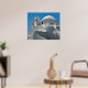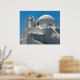 This lovely travel poster features the Church of Panagia Paraportiani in Mykonos, Greece literally meaning “Our Lady of the Side Gate”, takes its name from its location next to the side entrance to the mediaeval castle of the capital. The church is one of the most characteristic Cycladic architectural monuments and one of the most photographed Greek churches; a complex formed through time by unknown craftsmen who gradually turned a pile of rubble into an architectural masterpiece utterly compatible with the Aegean landscape. The present day church is actually made up of five attached churches. Located in the Kastro quarter at the edge of the port, Panagia (Our Lady) Paraportiani is regarded as the jewel of Mykonos. The name Paraportiani is delivered from the word paraporti “little door” in the Mykonian dialect) because it was built besides the gate to the old medieval castle. The Byzantine church, built above Aghios Efstathios, is distinguished by its exceptional form, asymmetrical mass and low, stepped bell tower. The entire complex, combined with the marks left by time, stands as an exceptional monument that is considered a leading example of Cycladic popular architecture.