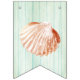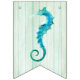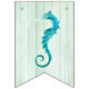 Beach wedding sea life themed bunting banner done in a sea cottage feel, with each flag having a pale aqua washed out wood look. Graphics of sea horses, coral, and shells decorate the flags with no letters. Mr. & Mrs. and bold white lettering on the middle flags, have graphics of a rope frame around each letter. Matching wedding products are available.