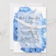 Invitations to a bridal shower with big blue hydrangea flowers design. A white starfish is also part of the image, and is tucked into the petals of a light blue flower. Customize black text in script for the party theme and honoree. Add all party information in paragraph form. Change the text and use for an engagement party as well.