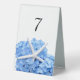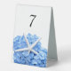 Tented, tall table number signs made of plastic. White with blue hydrangeas and starfish design and number template at the top. The design and number will print on both sides of 4x6 inch tall table seating.