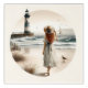 A graceful young woman in a flowing white dress wanders along the sandy shore, her sun hat tilted against the breeze as she gazes toward a striped lighthouse standing strong against the waves. Gentle grasses frame the foreground while seabirds and a sailboat drift across the horizon, adding a sense of calm movement to the coastal landscape. The soft watercolor style blends romance and serenity, creating a timeless cottagecore-inspired seaside scene that feels both nostalgic and dreamlike. AI generated artwork.