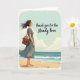 Designed with a calm coastal scene, the card shows a woman standing barefoot on warm sand near the shoreline, her full figure placed slightly left of center. A light breeze lifts her long dark hair and tugs at the hem of her muted teal dress, giving her pose a gentle, romantic softness ❤️. Behind her, the ocean stretches in quiet turquoise tones with small waves rolling in, while the sky fades from pale blue to creamy light with soft, fluffy clouds. Her eyes are closed and her face tilts slightly upward, as if she’s savoring the sun and sea air like a tender note from someone close. An earthy-toned satchel hangs from her shoulder, partly open to reveal a few practical items tucked inside. On the right side, the message “thank you for the steady love” appears in a flowing, dark ink style, balanced against the open sky. The horizon line sits low, and the foam of the waves traces a thin white edge where water meets sand 🌼, for sharing Mother's Day sentiments.