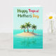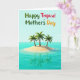 Designed with a serene tropical scene, this card shows a soft blue sky meeting wide turquoise water, creating a calm getaway mood ❤️. In the foreground, a tiny sandy islet sits like a private spot for two, with the quiet stillness suggesting closeness and shared time. Three palm trees rise from the sand, their green fronds spreading outward as the curved brown trunks lean as if in a light breeze. The water is clear enough to mirror the island and palms below, giving the scene a tender, reflective feel. A thin line of white foam traces where gentle waves touch the warm golden sand, adding a soothing contrast. Across the upper portion of the design, rounded lettering displays a festive greeting in green, red, and orange, standing out against the sky. The text is centered near the top and spaced comfortably, leaving the island scene open and airy 🌼. Below it, the palms and their reflections form a neat vertical echo in the glassy water beneath the bright horizon line.