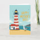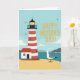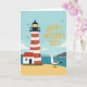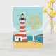This design shows a sunny seaside scene with a tall navigational tower painted in red-and-white stripes rising from a sandy beach. A small white cottage with a terracotta-colored roof sits tucked against the base, giving the shoreline a cozy, cared-for look ❤️. The sky is pale blue with a few rounded, cloud-like shapes drifting overhead, keeping the view open and calm. Beyond the sand, the water shifts from turquoise to deeper blue as it reaches a straight horizon with softly shaped hills in the distance. In the foreground, a white-and-gray seabird with an orange beak stands near the surf, angled as if quietly keeping watch, like a gentle companion waiting nearby 🌼. On the right side, the message “HAPPY MOTHER’S DAY!” appears in large golden-yellow letters, stacked in the upper-right area against the blue sky. The tower’s top has a warm yellow lantern section, and the beach is shaded in soft golden tones with subtle texture lines near the water’s edge.
