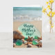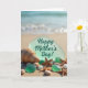 This card shows a close-up beach scene bathed in soft sunlight, with a calm shoreline blurred in the distance. At the center sits a large, smooth piece of sea-worn glass in pale seafoam green, glowing gently as if it’s been warmed by the day. Across the glass, the words “Happy Mother’s Day!” appear in darker green lettering, placed neatly in the middle so it stands out without overpowering the natural textures. To the left, a large spiral shell in sandy beige rests close by, angled toward the glass like it’s keeping it company, adding a quiet, affectionate feel ❤️. Around them, smaller ribbed shells and a few five-point sea stars are scattered, their shapes arranged in a way that feels like a thoughtful gathering rather than a random spill. Polished bits of sea glass in deeper green and milky white sit between the shells, catching tiny highlights that flicker like shared glances 🌼. Fine grains of sand fill the foreground, while faint foamy waves and a sun-dappled ocean soften the background behind the arrangement.