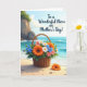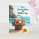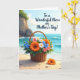 This greeting card shows a woven basket of fresh flowers resting on sunlit, fine-grained sand, with the sea stretching out behind it. Orange daisy-like blooms, white daisies, soft pink petals, and tiny blue florets sit among leafy greens, creating a gentle, affectionate mix of color that feels like a caring gesture ❤️. In the distance, blue water rolls in with small white-tipped waves, and a green cliff rises along the left side of the shoreline. Light from above casts soft shadows around the basket, giving the scene a calm, intimate look, like a quiet moment shared between close family or friends. The message “To a Wonderful Niece on Mother’s Day!” appears over the sky and water area in dark lettering, easy to spot without covering the flowers. A single orange flower lies on the sand beside the basket, as if it was set down tenderly 🌼. Fine details show the basket’s tight weave, the froth of sea foam near the shore, and the warm sparkle of sand grains in the foreground.